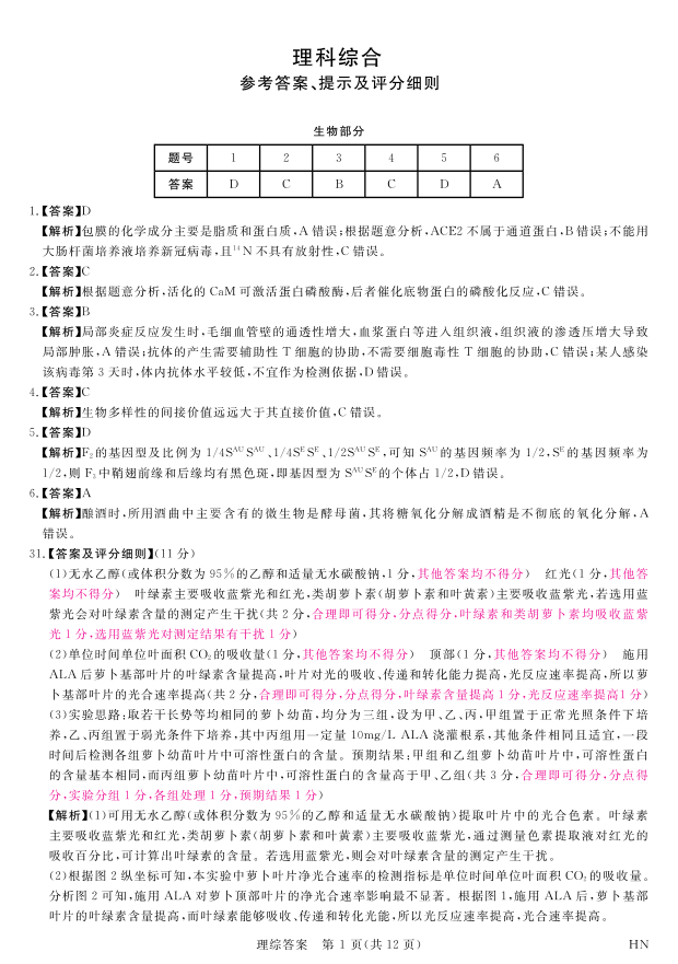 河南省八市重点高中2024届高三4月第一次模拟理科综合答案