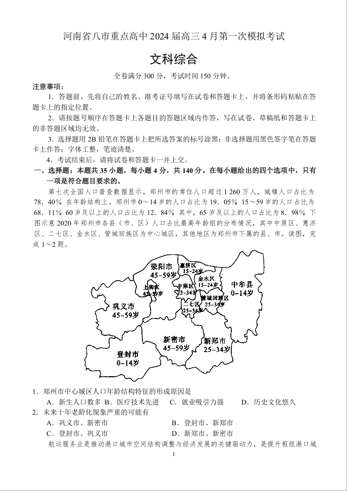 河南省八市重点高中2024届高三4月第一次模拟文科综合