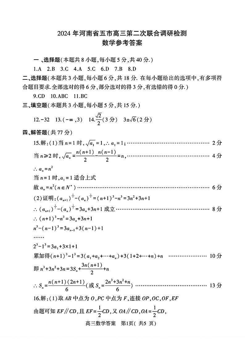 河南省五市2024届高三第二次联考数学答案