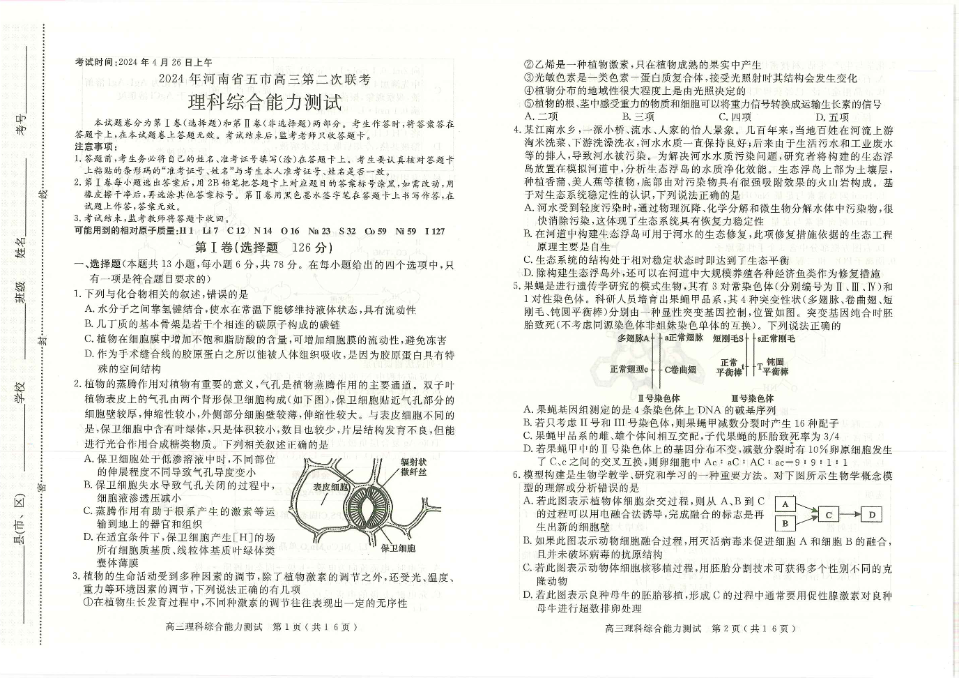 河南省五市2024届高三第二次联考理科综合