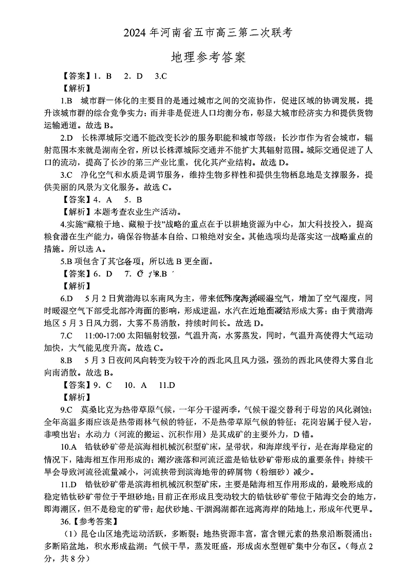 河南省五市2024届高三第二次联考地理答案