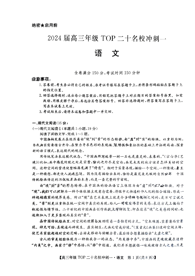 河南省TOP二十名校2024届高三下学期4月冲刺(一)语文+答案