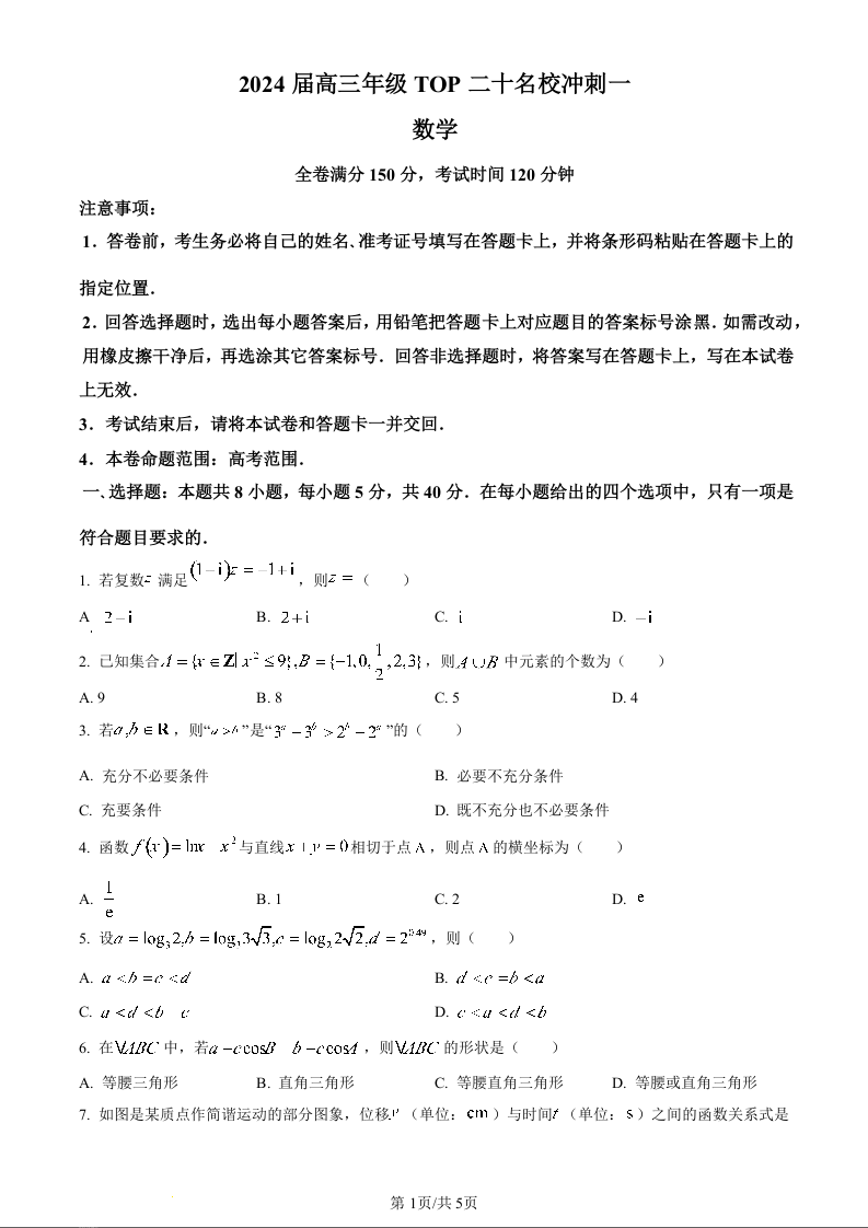 河南省TOP二十名校2024届高三下学期4月冲刺一数学试卷(原卷版)