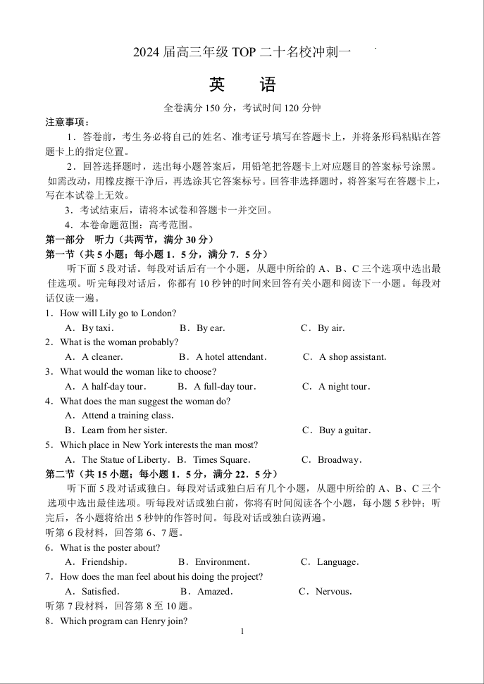 河南省TOP二十名校2024届高三下学期4月冲刺(一)英语