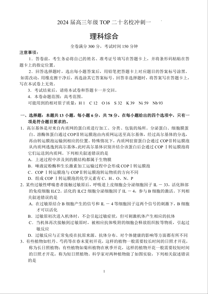 河南省TOP二十名校2024届高三下学期4月冲刺(一)理科综合