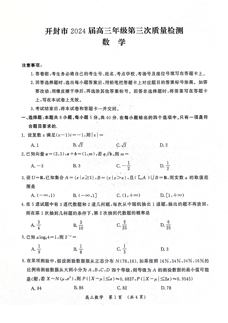 河南省开封市2024届高三年级第三次质量检测(三模)数学