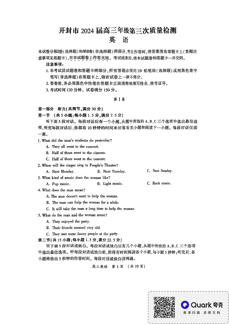 河南省开封市2024届高三年级第三次质量检测(三模)英语
