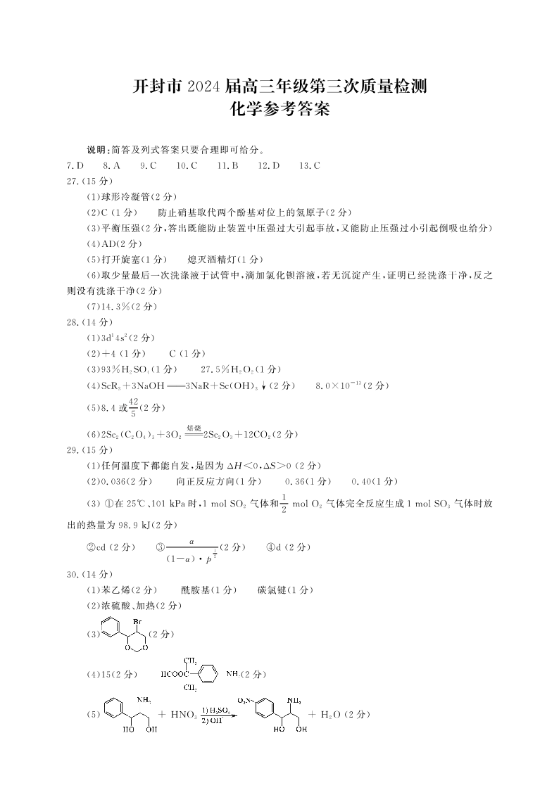 河南省开封市2024届高三年级第三次质量检测(三模)化学答案