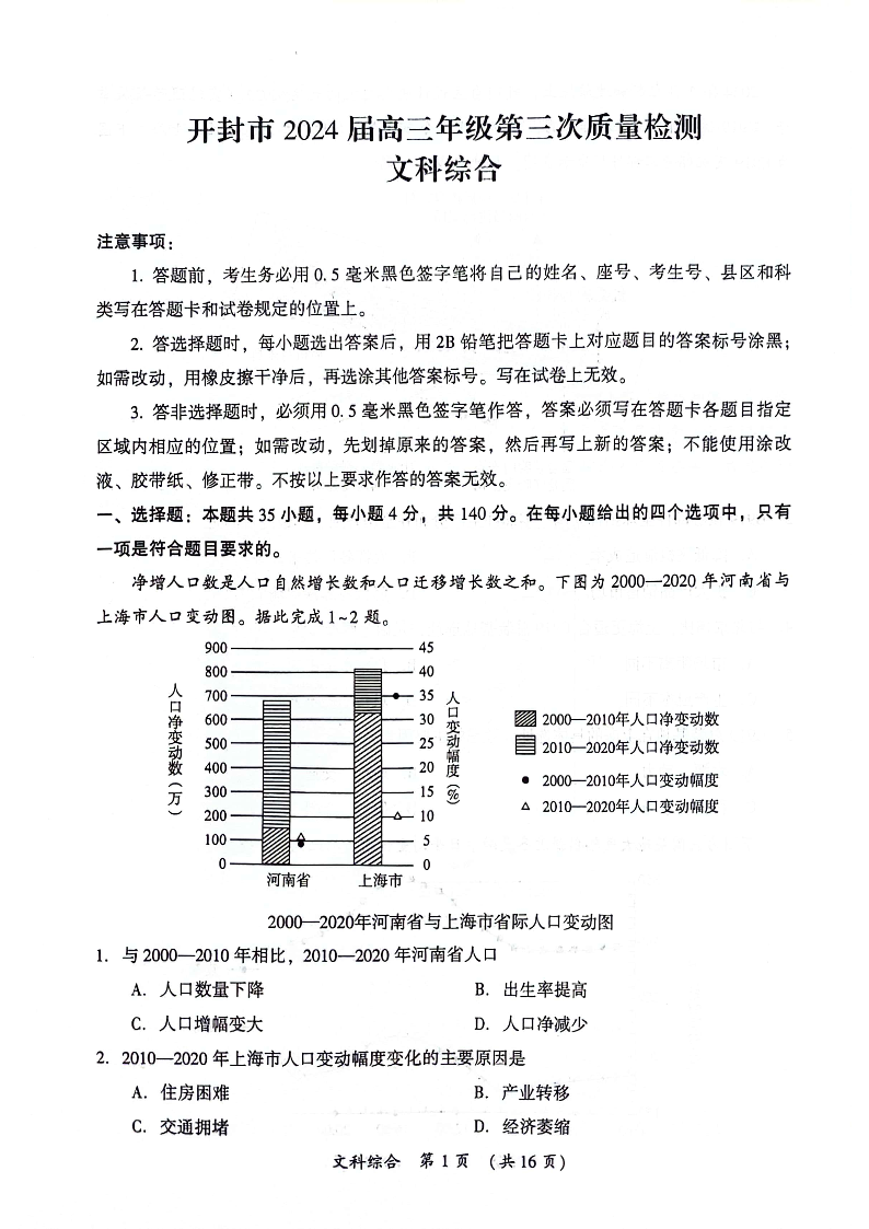 河南省开封市2024届高三年级第三次质量检测(三模)文科综合