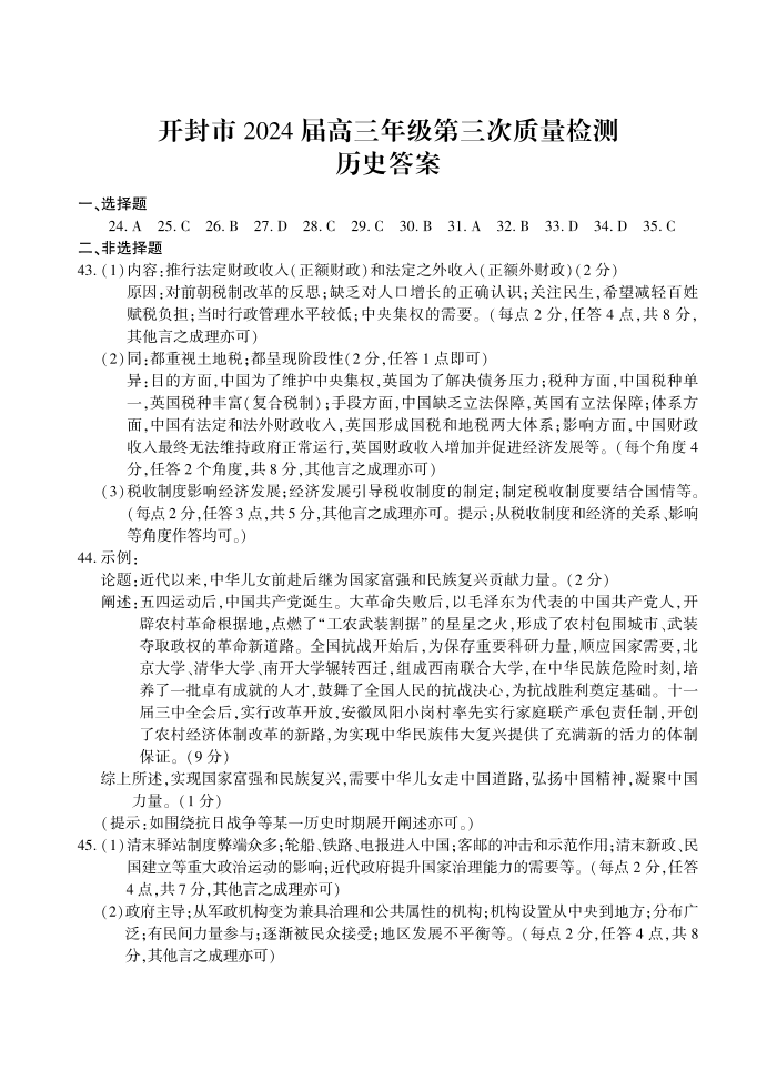 河南省开封市2024届高三年级第三次质量检测(三模)历史答案