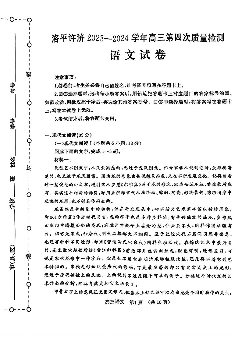 河南省平许济洛四市2024届高三下学期第四次质量检测语文