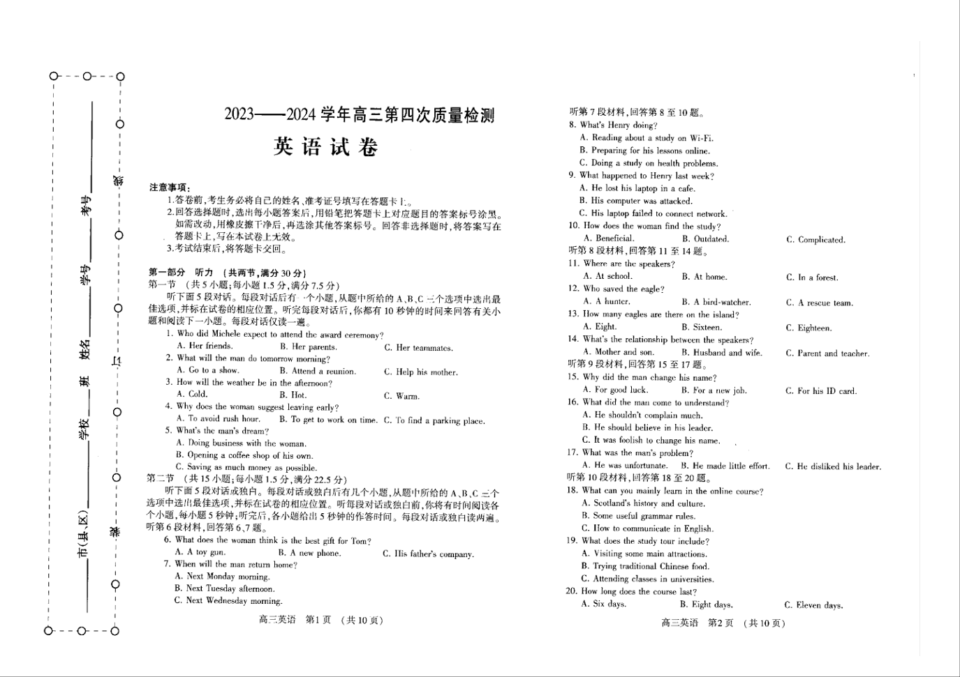 河南省平许济洛四市2024届高三下学期第四次质量检测英语