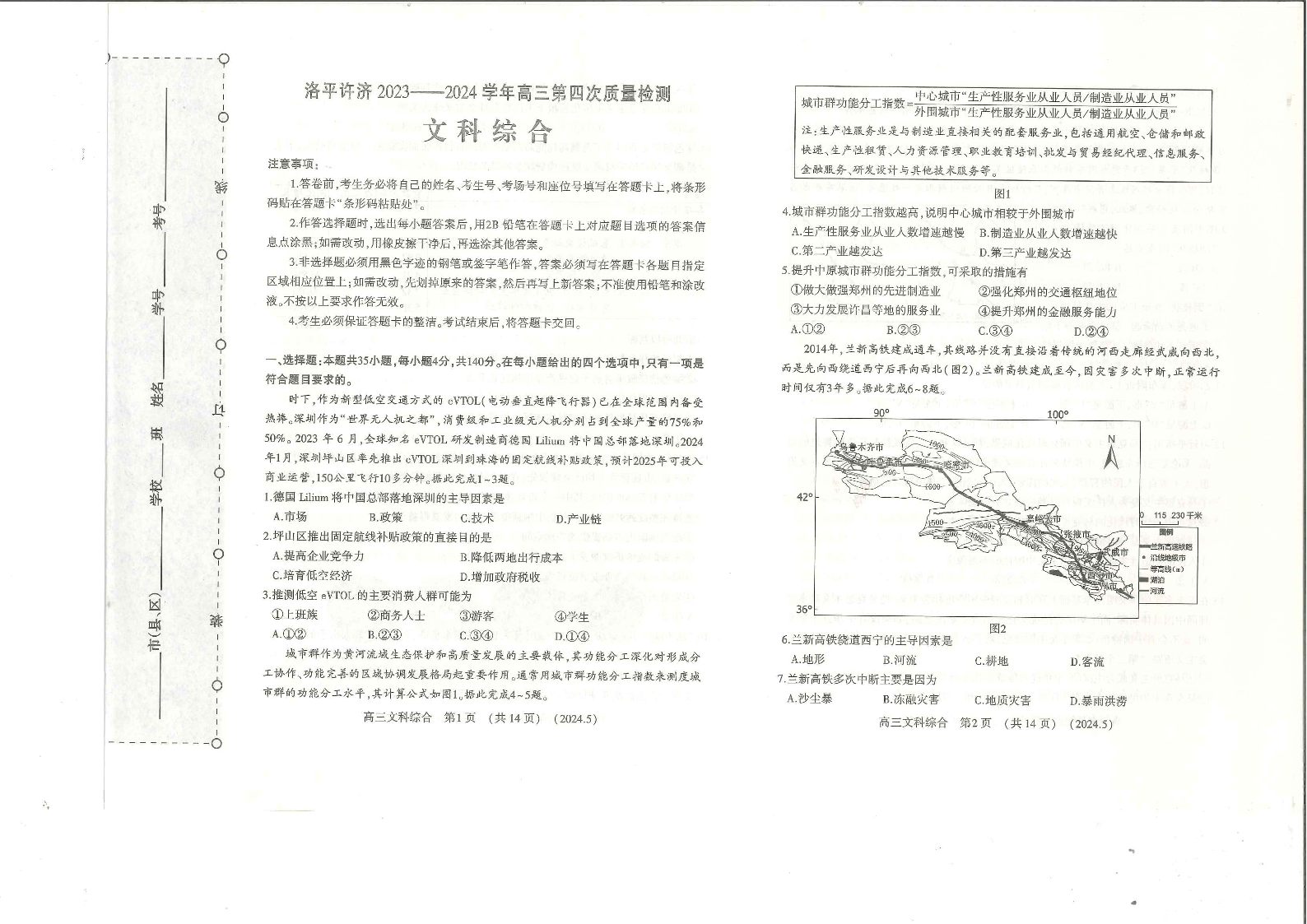 2024届河南省平许济洛四市高三下学期第四次质量检测文科综合