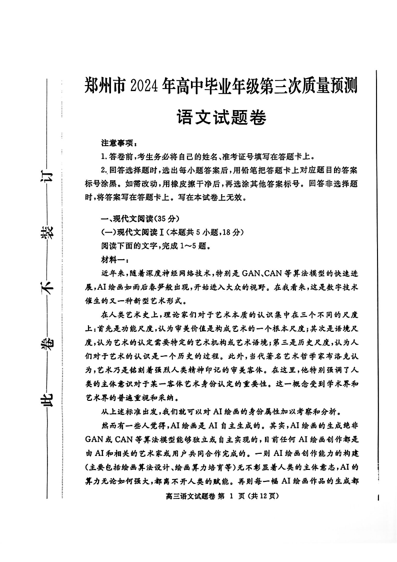 河南省郑州市2024届高三下学期第三次质量预测语文