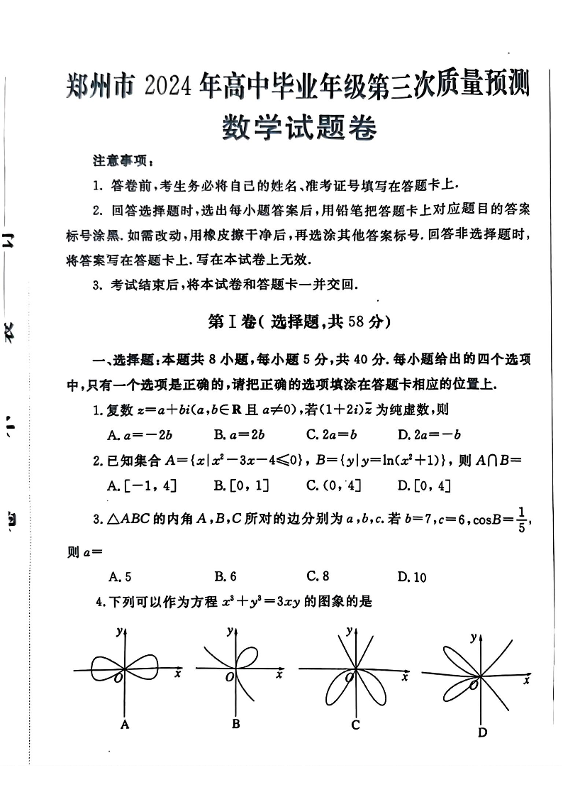 河南省郑州市2024届高三下学期第三次质量预测数学