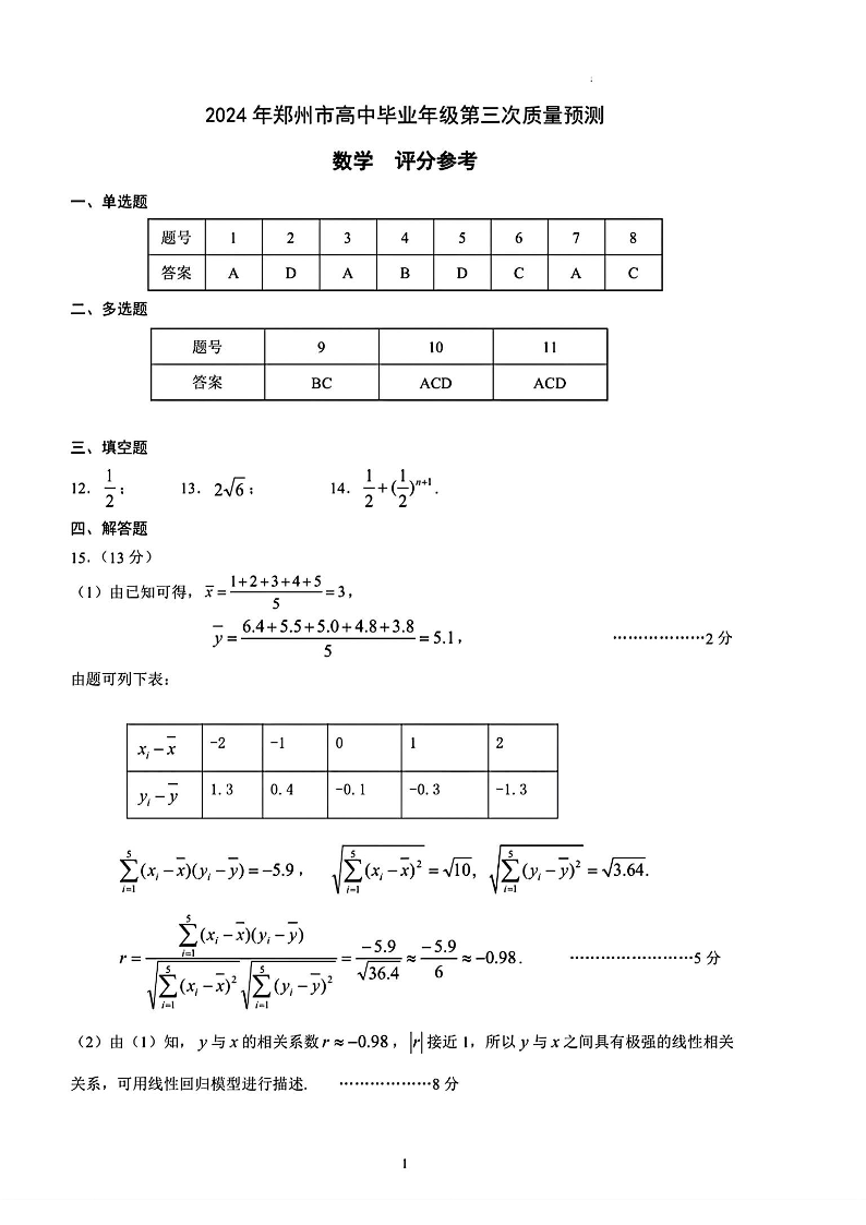 河南省郑州市2024届高三下学期第三次质量预测数学答案