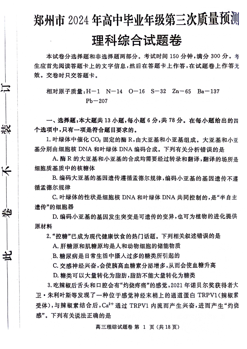 2024届河南省郑州市高三下学期第三次质量预测理科综合