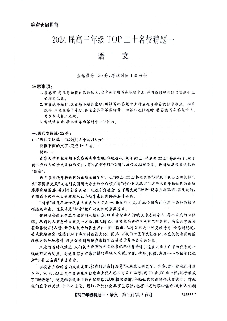 河南省TOP二十名校2024届高三年级5月联考猜题(一)语文