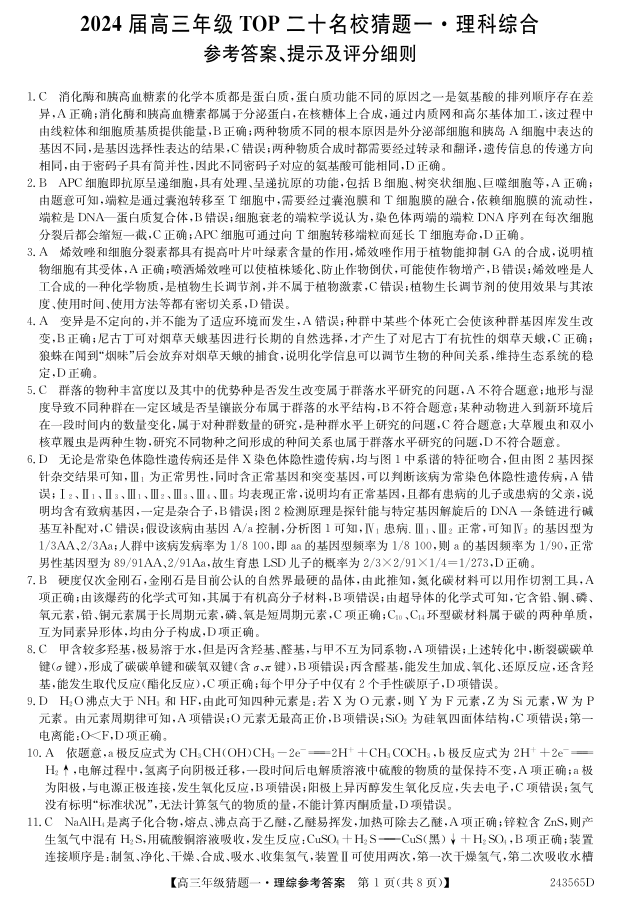 河南省TOP二十名校2024届高三年级5月联考猜题(一)理科综合答案