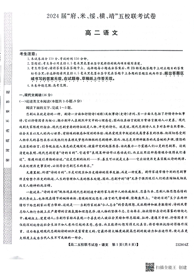 2024届陕西省榆林市“府、米、绥、横、靖”五校联考高三上学期开学考试 语文