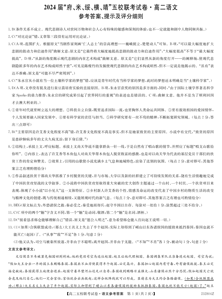 2024届陕西省榆林市“府、米、绥、横、靖”五校联考高三上学期开学考试 语文答案
