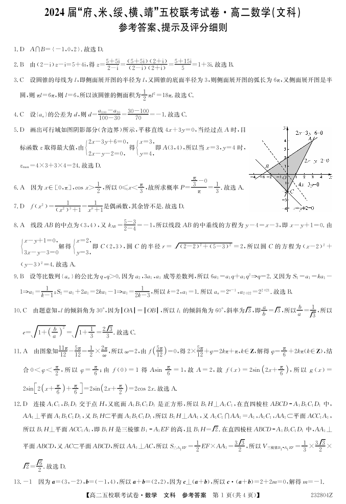 2024届陕西省榆林市“府、米、绥、横、靖”五校联考高三上学期开学考试 文数答案
