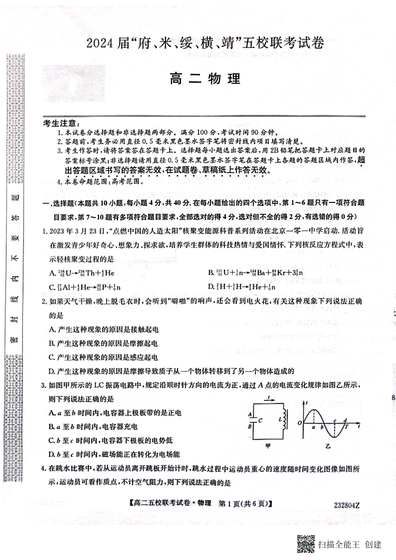 2024届陕西省榆林市“府、米、绥、横、靖”五校联考高三上学期开学考试 物理