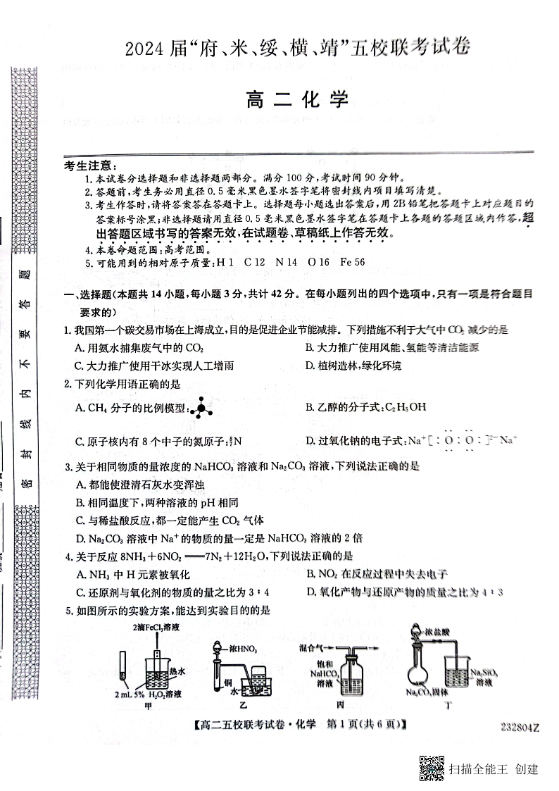 2024届陕西省榆林市“府、米、绥、横、靖”五校联考高三上学期开学考试 化学