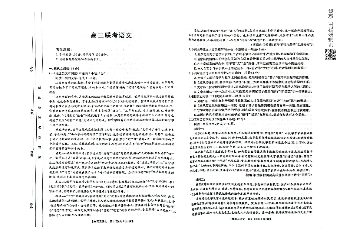 陕西省汉中市2023-2024学年上学期高三年级第一次联考语文