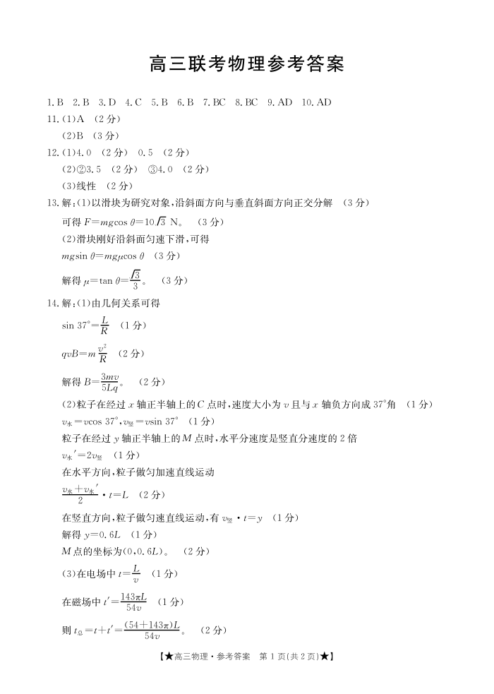 陕西省汉中市2023-2024学年上学期高三年级第一次联考物理答案