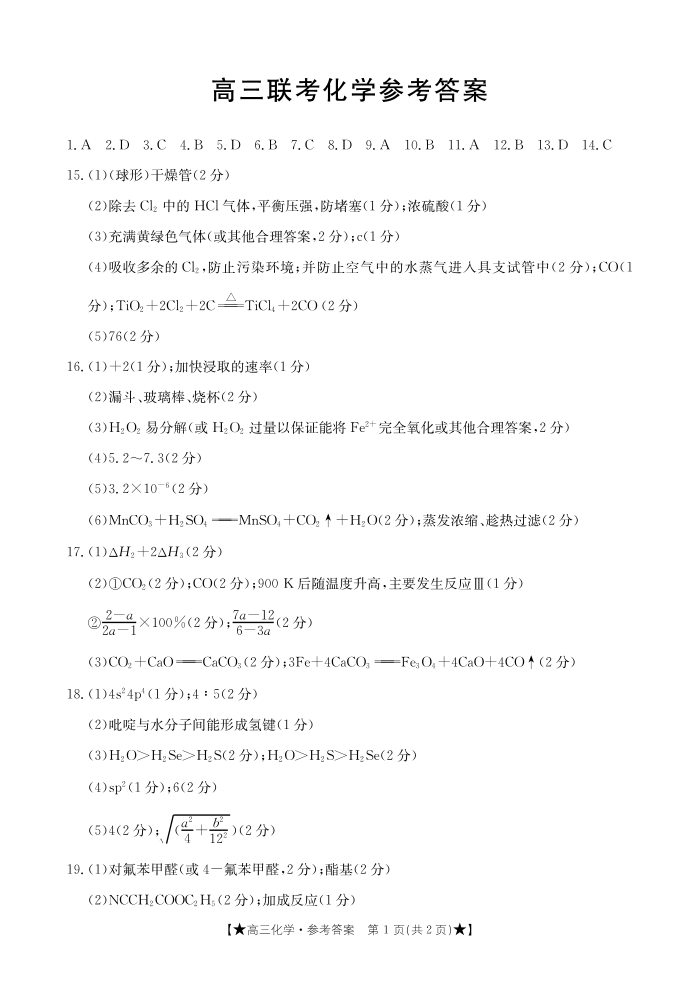 陕西省汉中市2023-2024学年上学期高三年级第一次联考化学答案