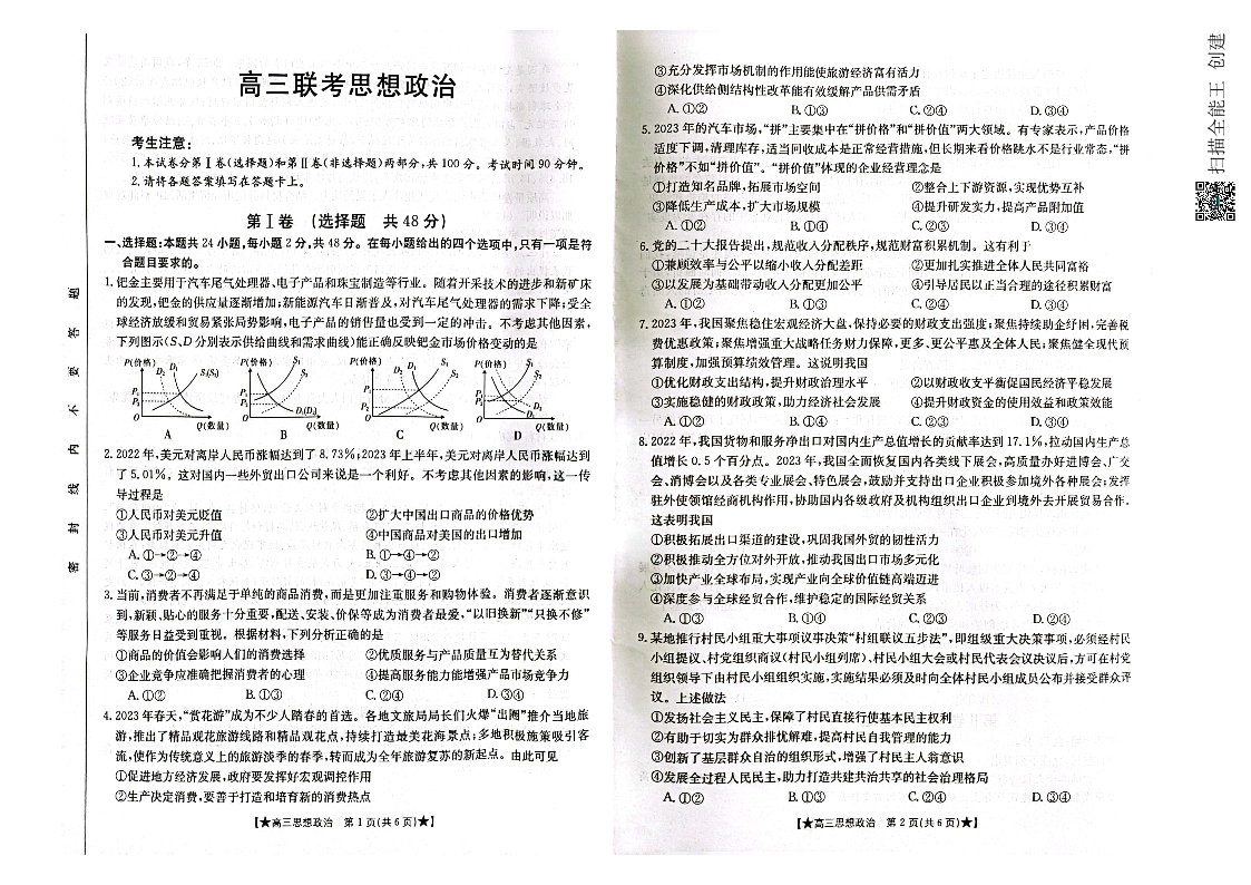 陕西省汉中市2023-2024学年上学期高三年级第一次联考政治