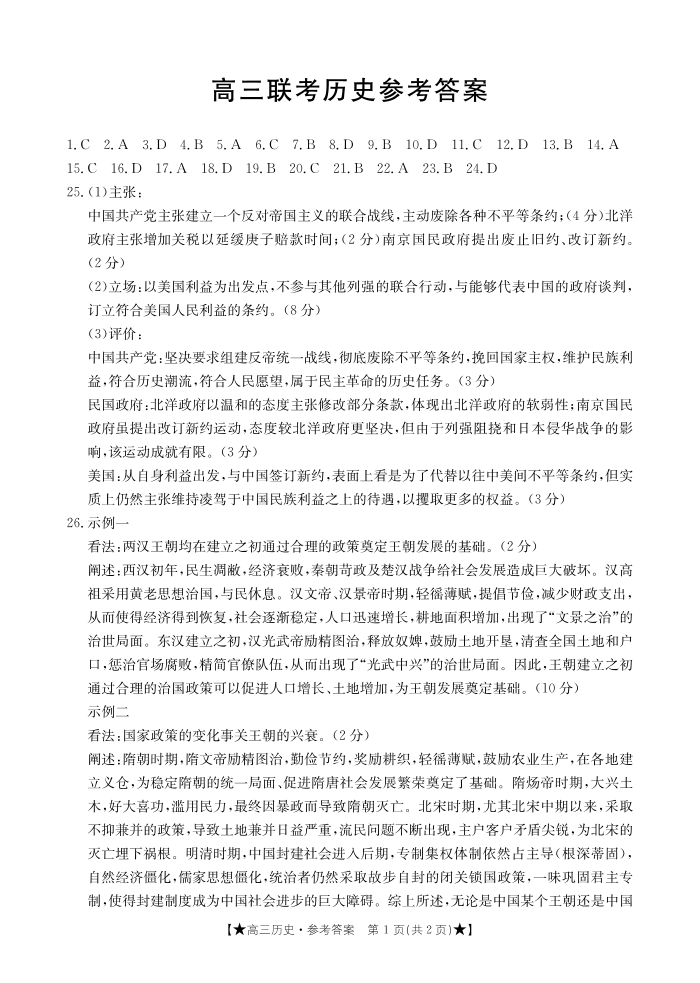 陕西省汉中市2023-2024学年上学期高三年级第一次联考历史答案