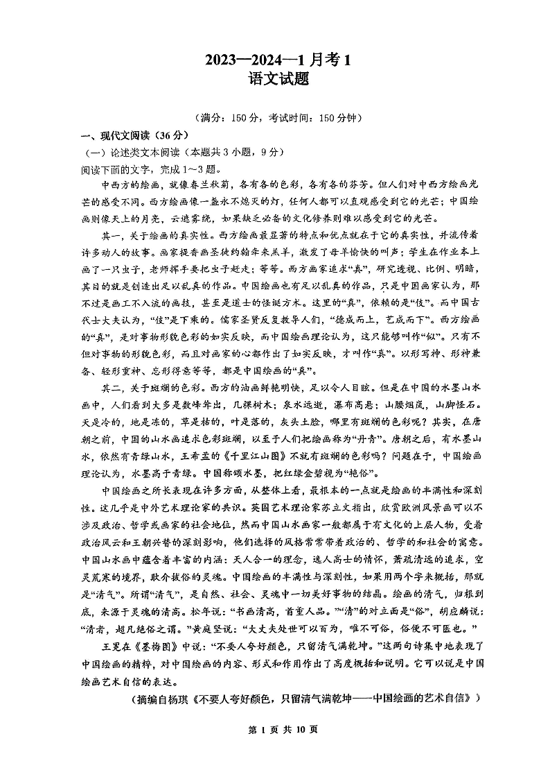 陕西省西安市铁一中学2024届高三上学期9月月考语文