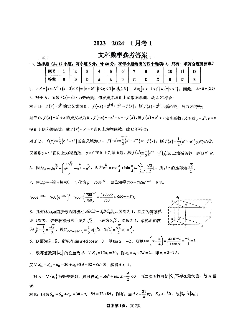 陕西省西安市铁一中学2024届高三上学期9月月考文数答案