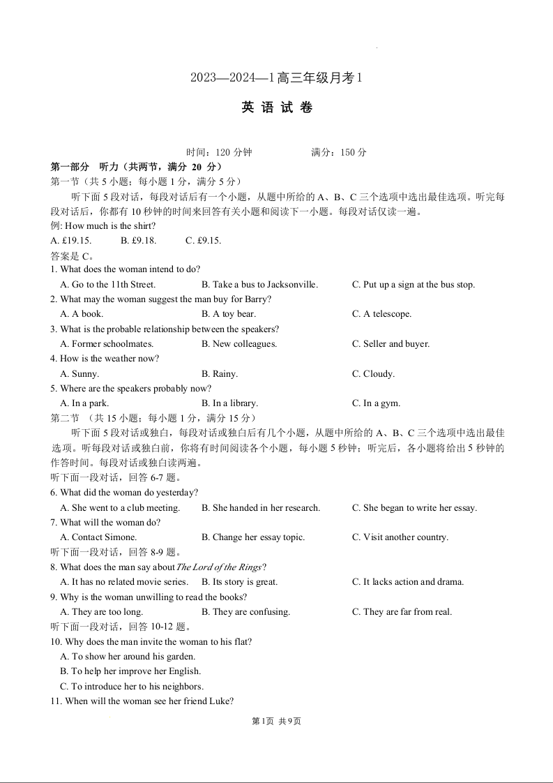 陕西省西安市铁一中学2024届高三上学期9月月考英语