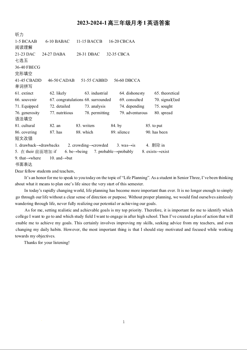 陕西省西安市铁一中学2024届高三上学期9月月考英语答案