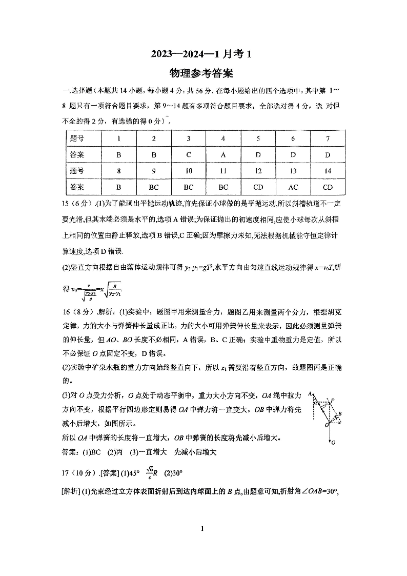 陕西省西安市铁一中学2024届高三上学期9月月考物理答案