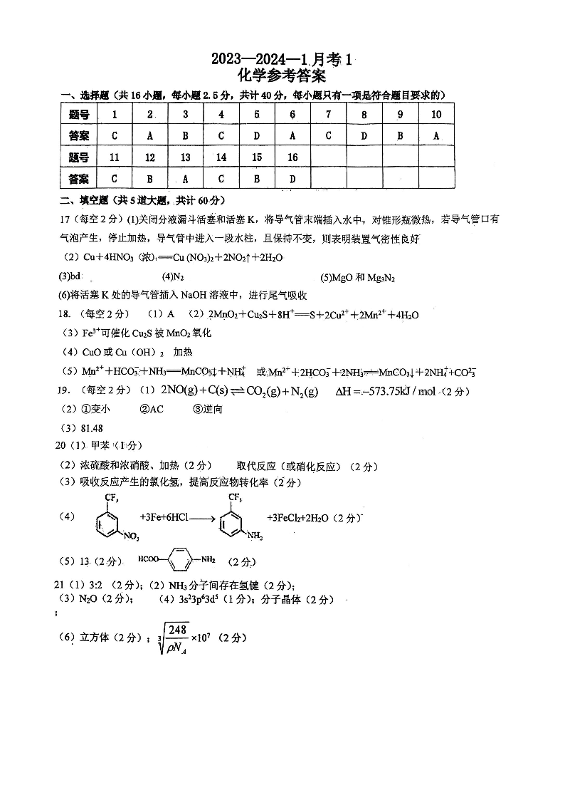 陕西省西安市铁一中学2024届高三上学期9月月考化学答案