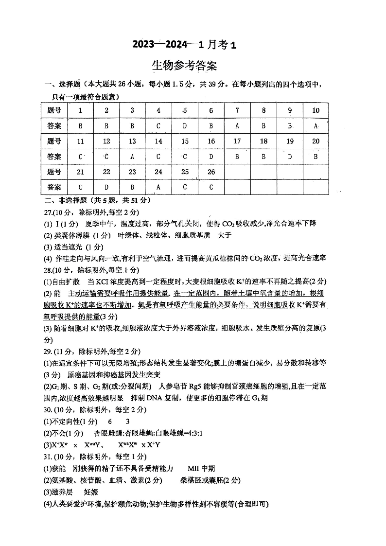 陕西省西安市铁一中学2024届高三上学期9月月考生物答案