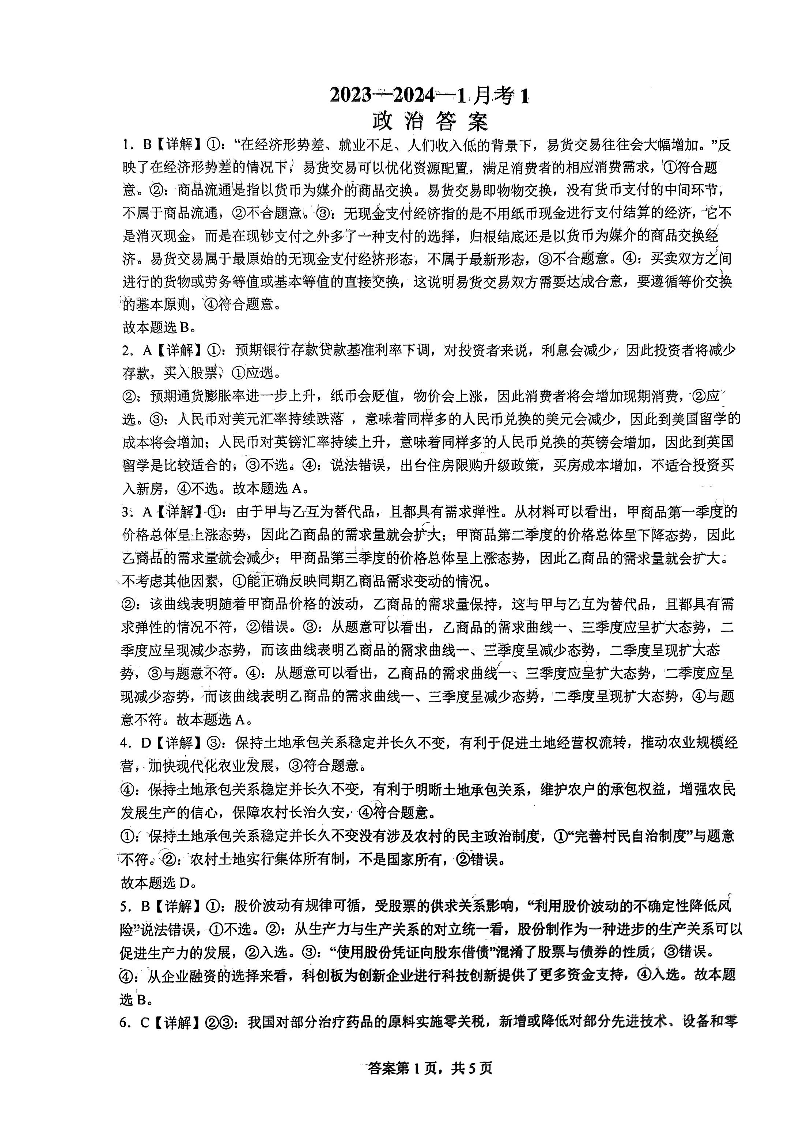 陕西省西安市铁一中学2024届高三上学期9月月考政治答案