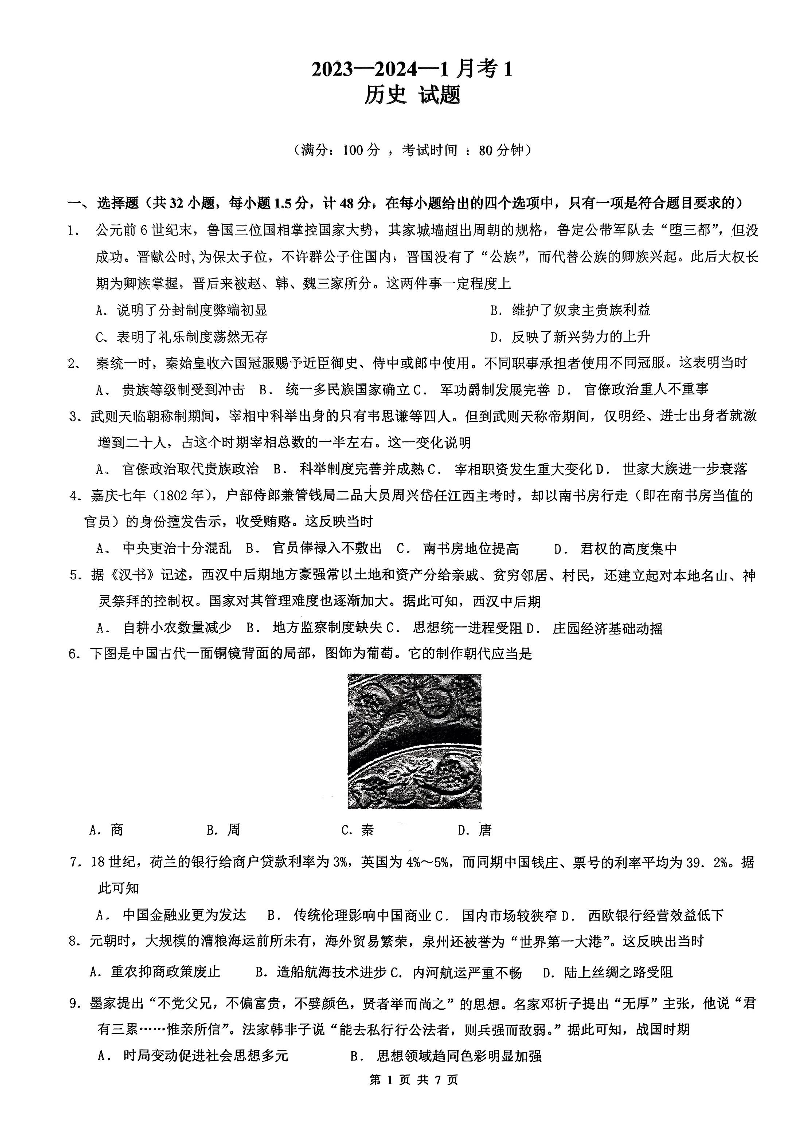 陕西省西安市铁一中学2024届高三上学期9月月考历史