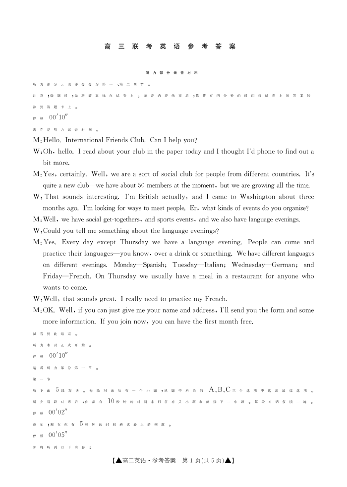 陕西省部分学校2024届高三上学期第一次联考英语答案