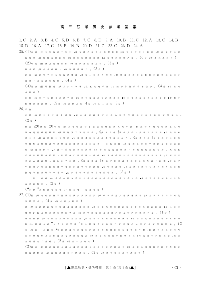 陕西省部分学校2024届高三上学期第一次联考历史答案
