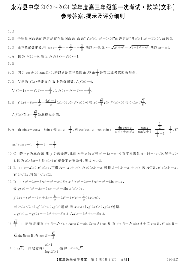 陕西省咸阳市永寿县中学2023-2024学年度高三第一次考试文数答案