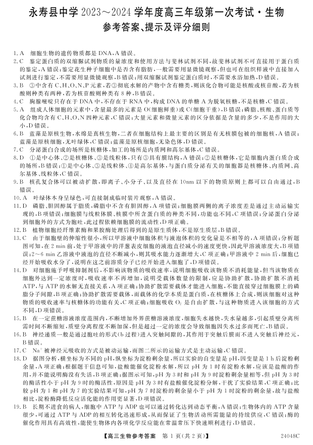 陕西省咸阳市永寿县中学2023-2024学年度高三第一次考试生物答案