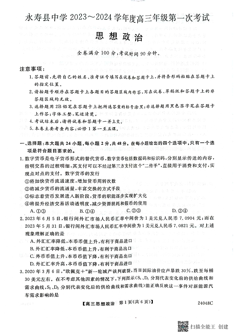 陕西省咸阳市永寿县中学2023-2024学年度高三第一次考试政治