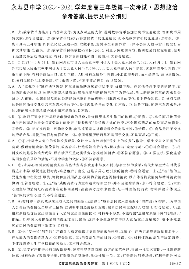 陕西省咸阳市永寿县中学2023-2024学年度高三第一次考试政治答案