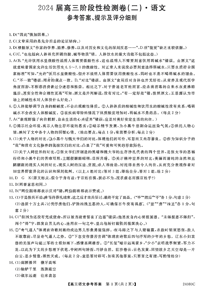 陕西省宝鸡教育联盟2024届高三上学期阶段性检测(二)语文答案