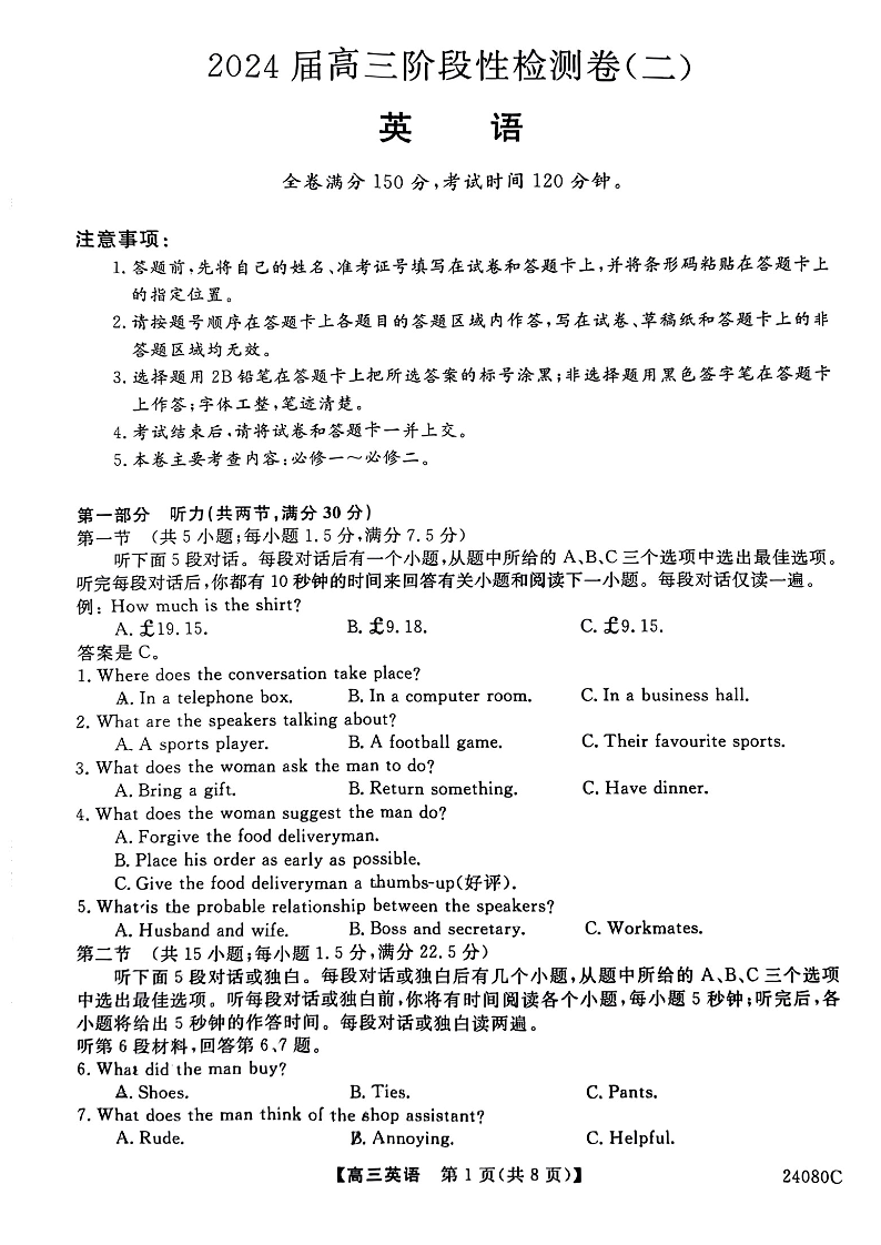 陕西省宝鸡教育联盟2024届高三上学期阶段性检测(二)英语